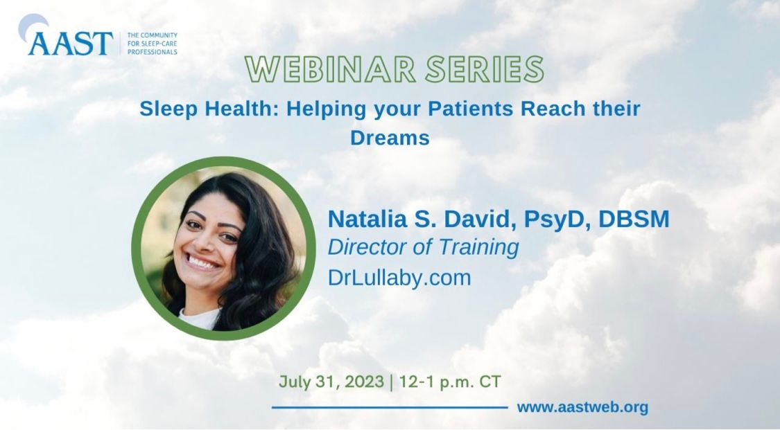 Join Dr. David for a Lunchinar on Sleep Health with the American Academy of Sleep Technologists! Learn how sleep impacts mental and physical health, how to assess for common sleep disorders, and how to provide your patients with strategies to improve their sleep and quality of life using evidence-based approaches.